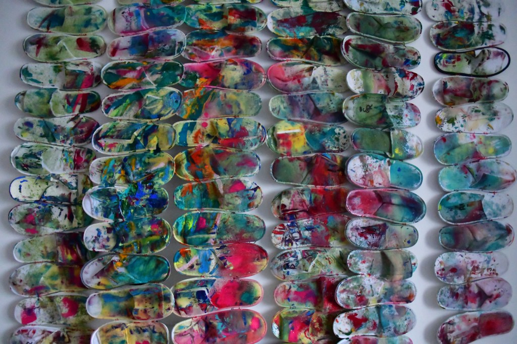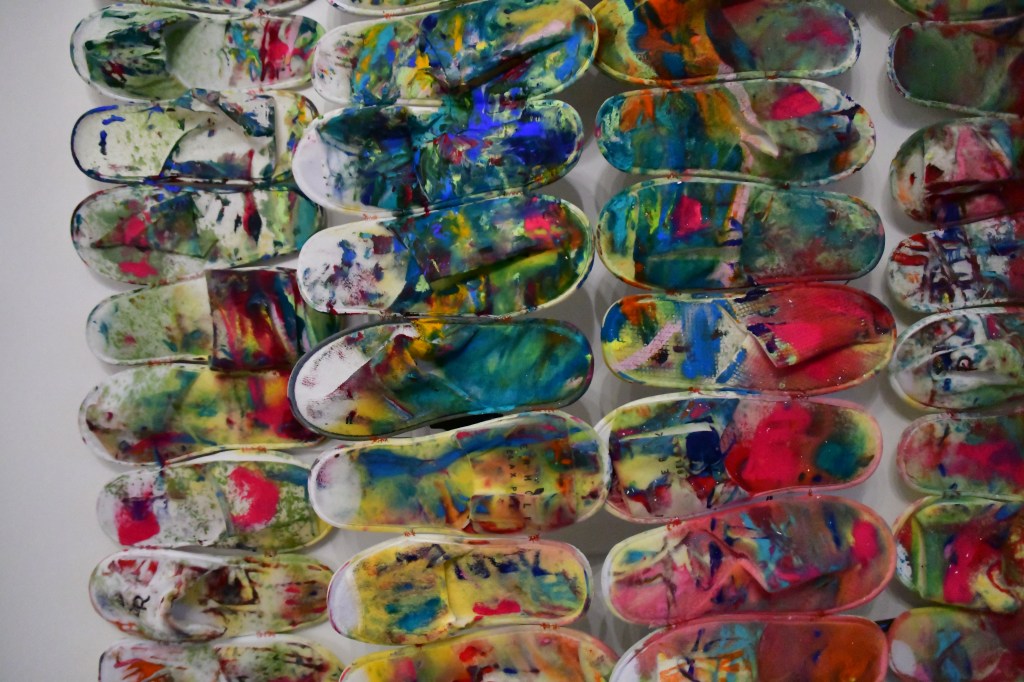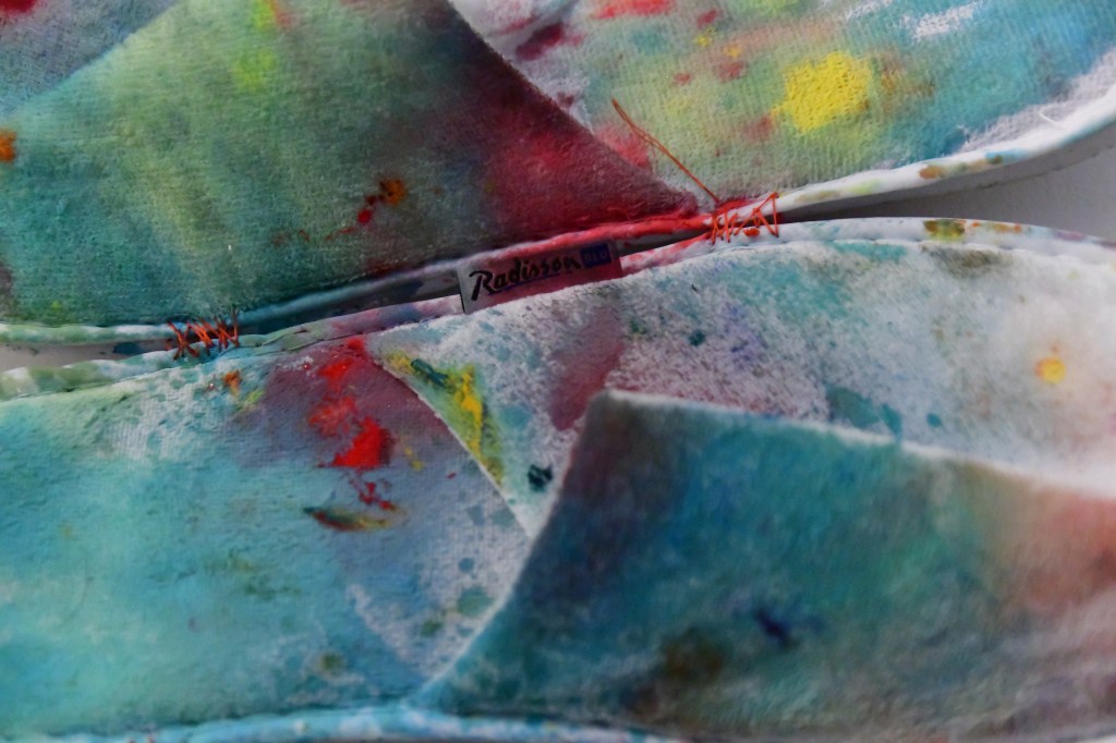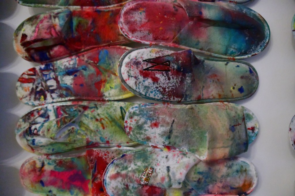Wall installation Guests, it is about the reverent feeling of preparation for receiving dear guests at home. This is fun, and the homely party is cosy. Here are your slippers for comfort, here’s a carpet of their slippers, I diligently collected from all hotels when I travelled around the world. I sewed and painted, and this is my canvas. It has a special texture. They have preserved the names of brands of hotels where I visited and where I found these slippers. Collected for several years.