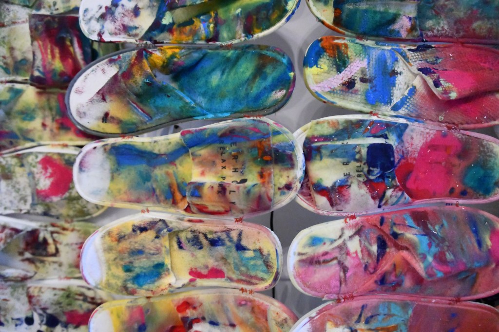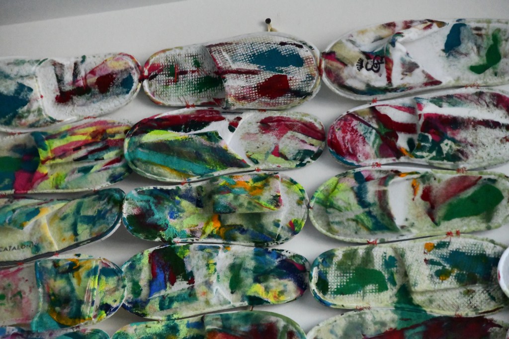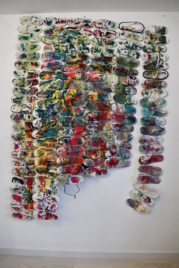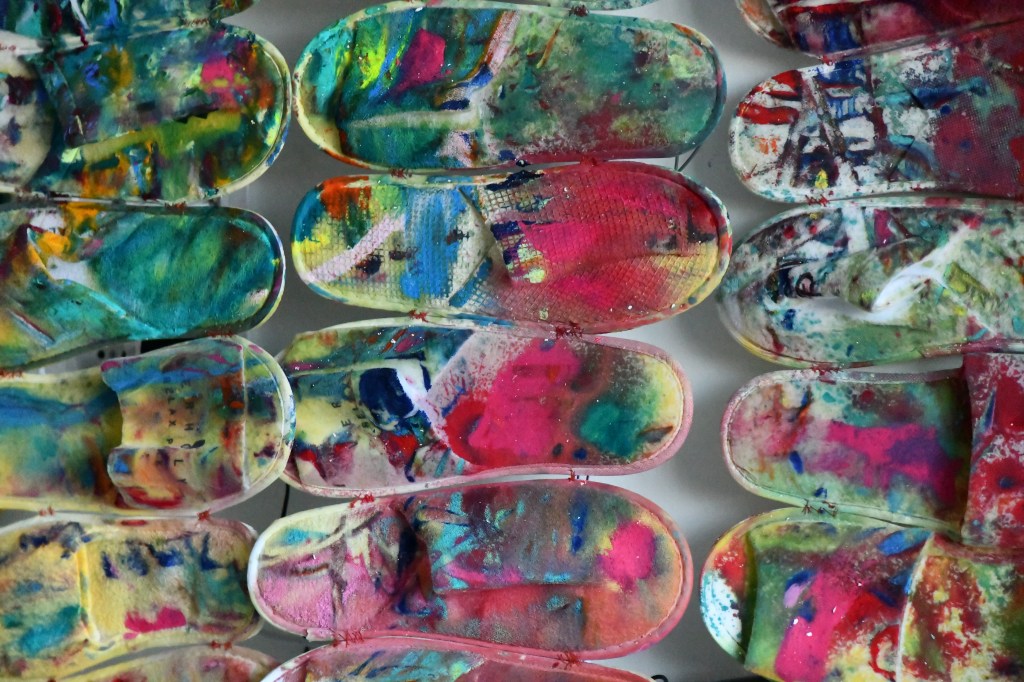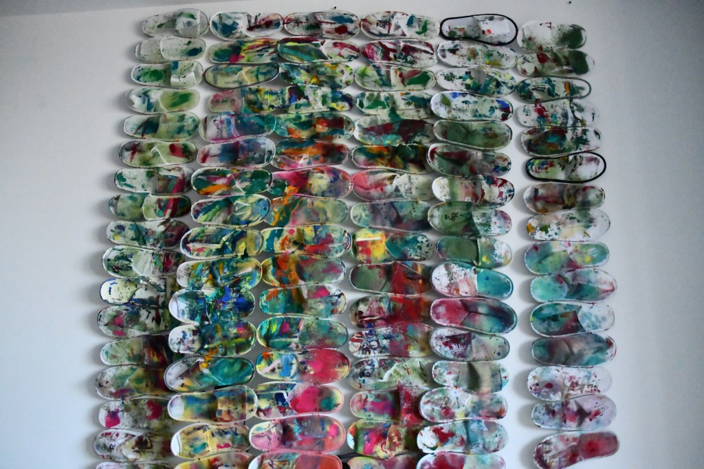 Wall installation Guests, it is about the reverent feeling of preparation for receiving dear guests at home. This is fun, and the homely party is cosy. Here are your slippers for comfort, here’s a carpet of their slippers, I diligently collected from all hotels when I travelled around the world. I sewed and painted, and this is my canvas. It has a special texture. They have preserved the names of brands of hotels where I visited and where I found these slippers. Collected for several years.
