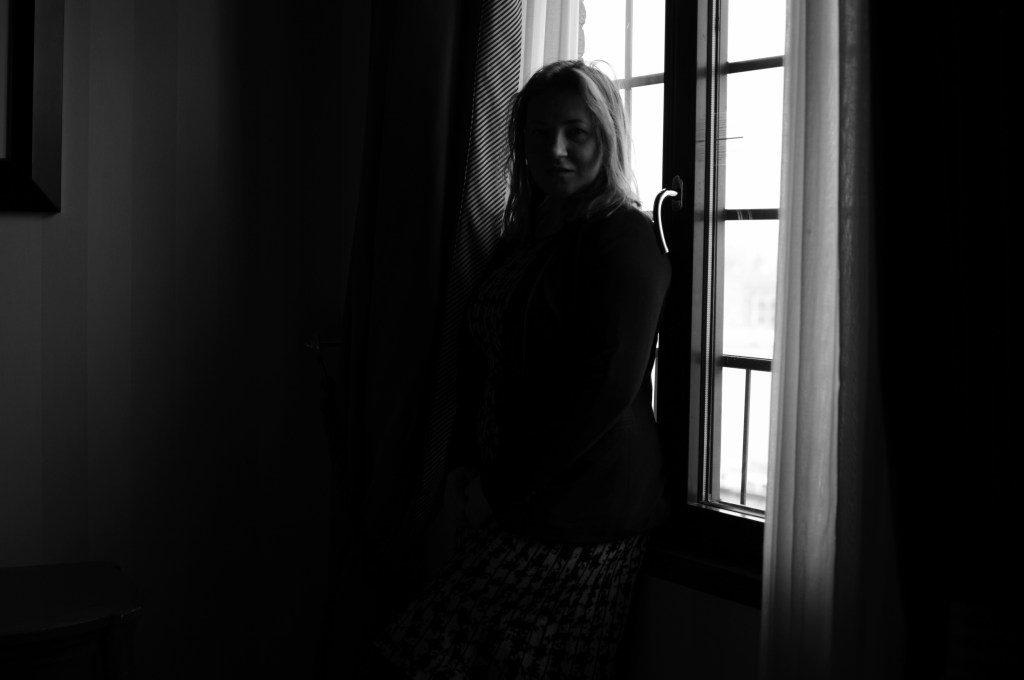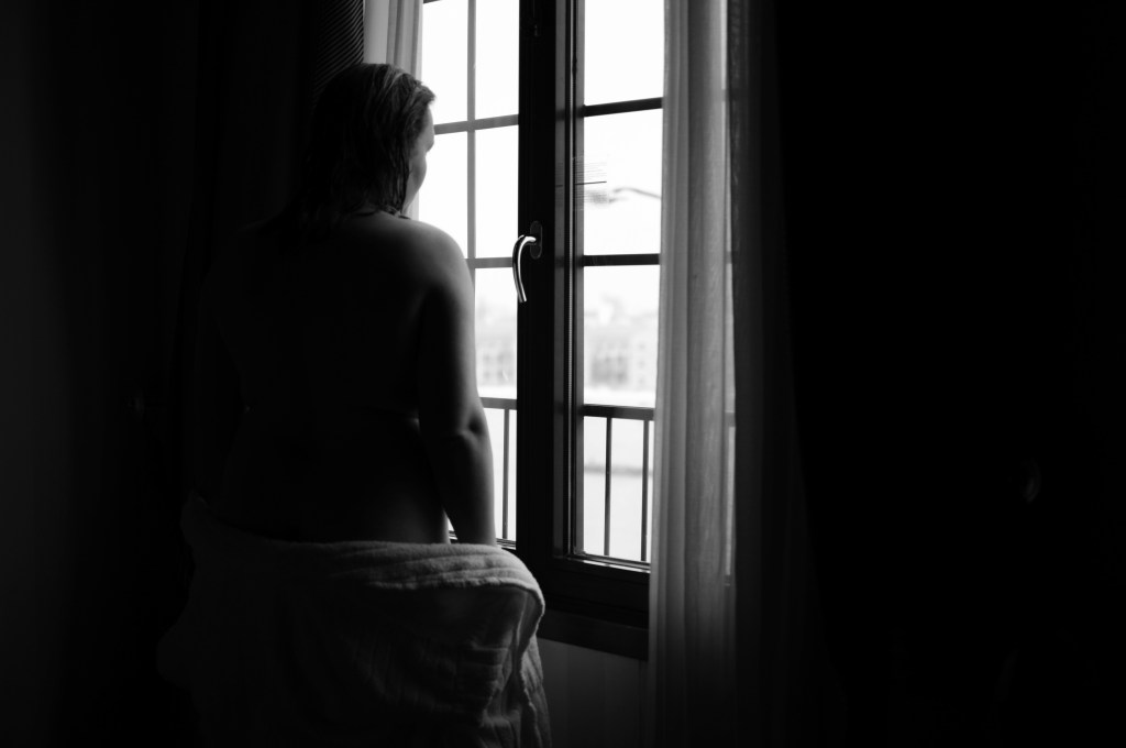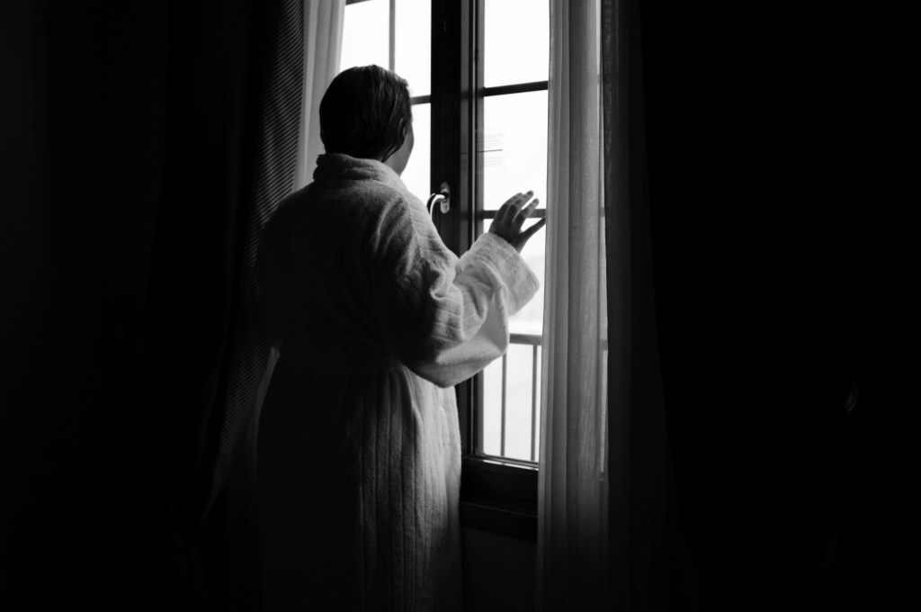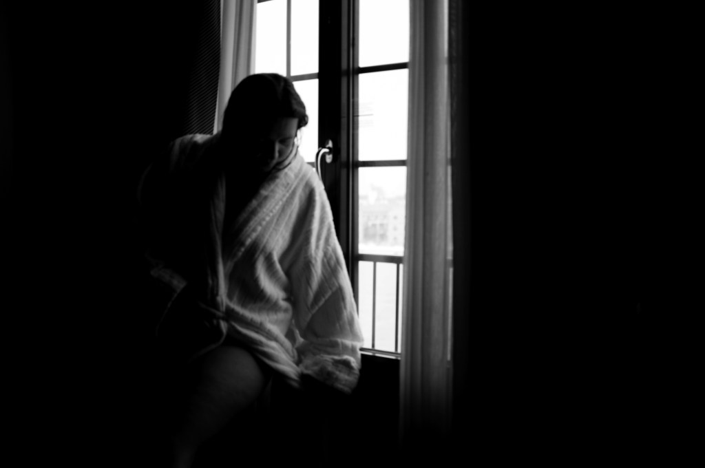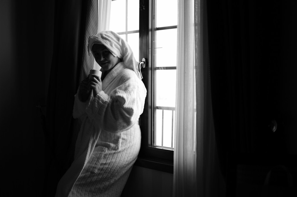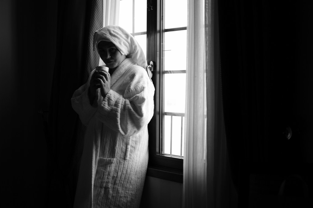 A series of selfie photos in the hotel near the window. Morning shower ritual, drinking water and coffee.