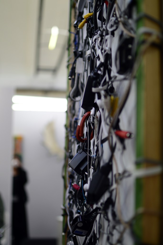 Some small things hang like jewellery, a phone, a camera, and an electronic bracelet; it’s all part of the work on this object. This is her addition.