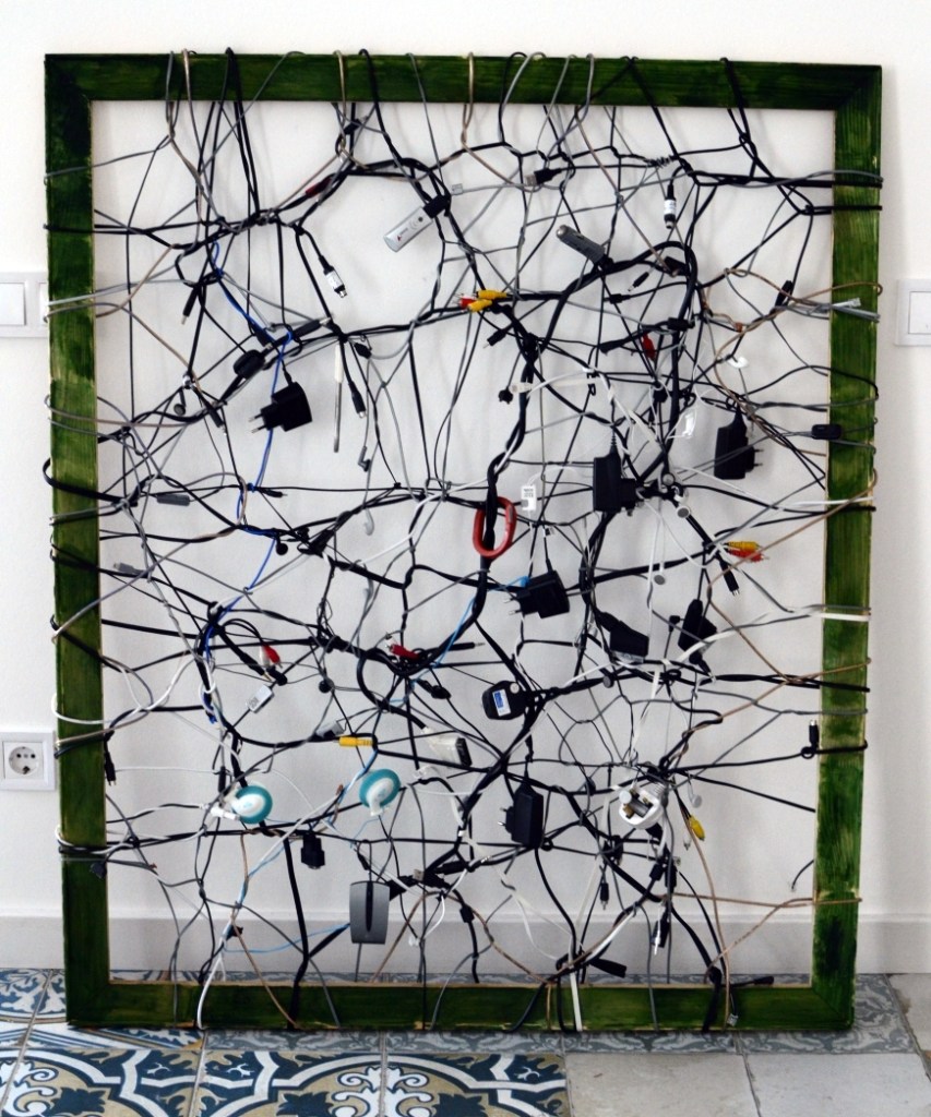 Because of the wires from the charging of the once-popular brand of personal phone. Wires, charging this has become my art resource for creating interesting bright weaving.