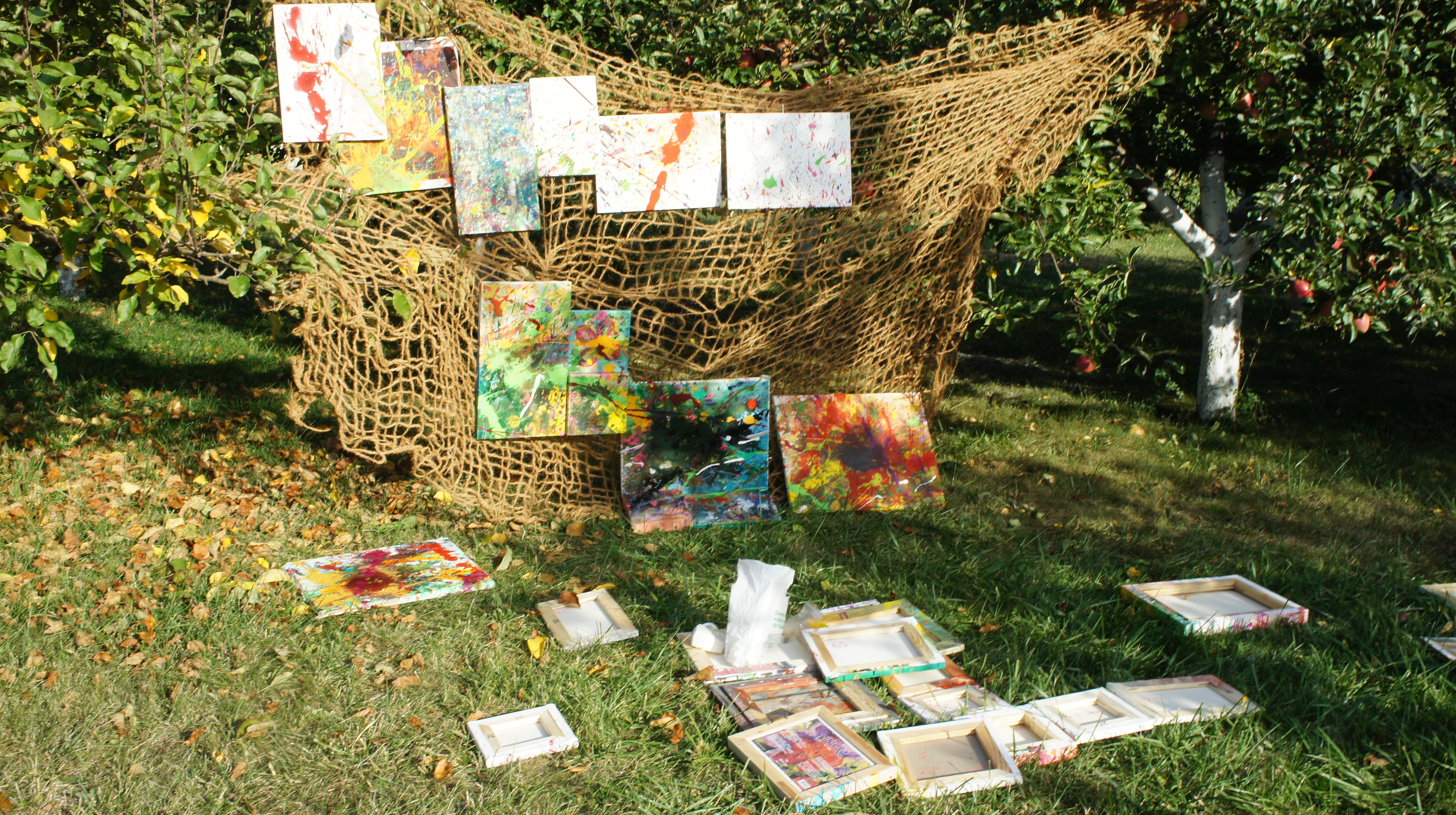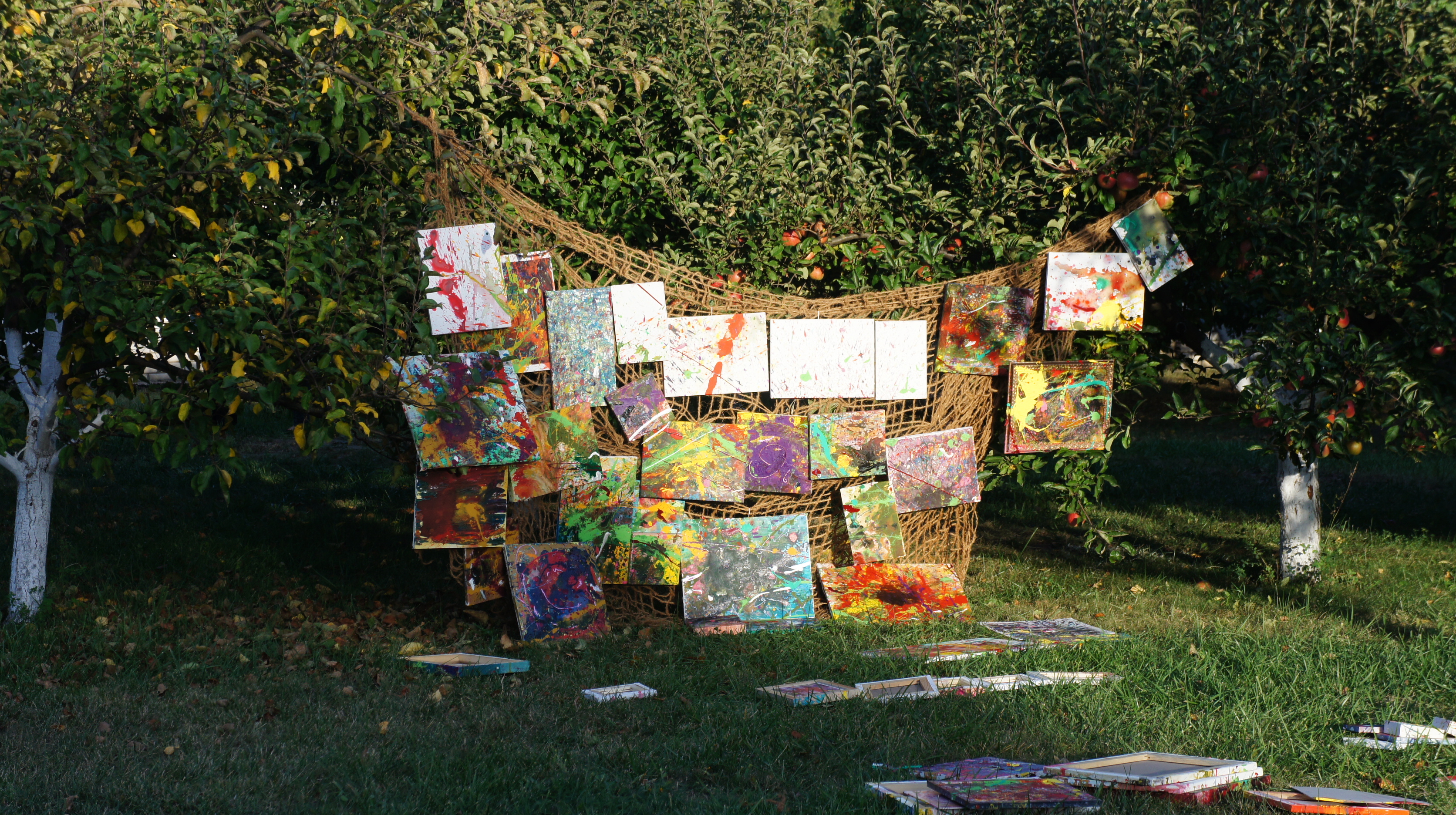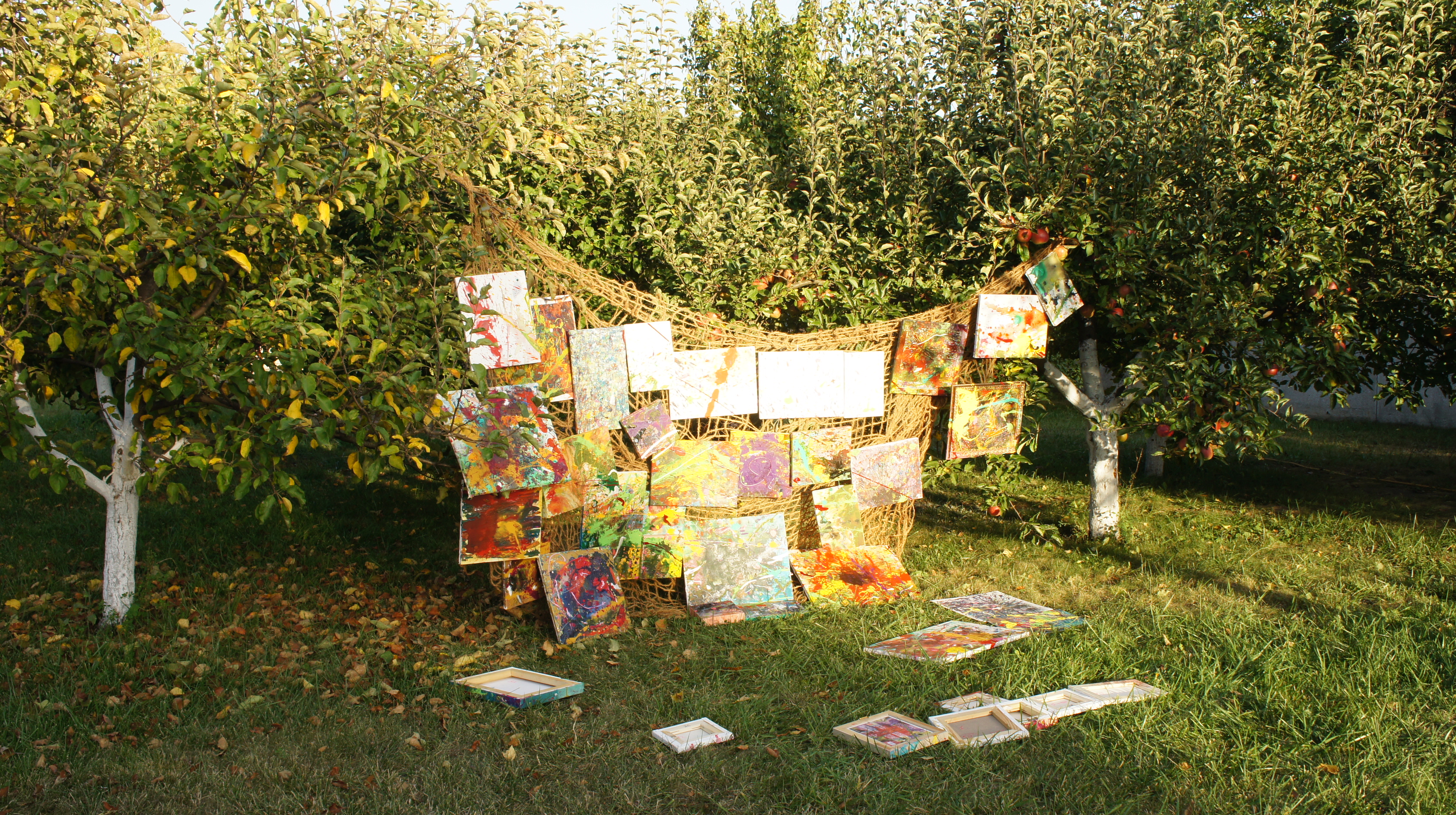 I wrote my works in the family garden. Installation of a series of splashes of colours on the branches of an apple tree. This can be said to be my interpretation of spring flowers on an apple tree. Paints, canvas.