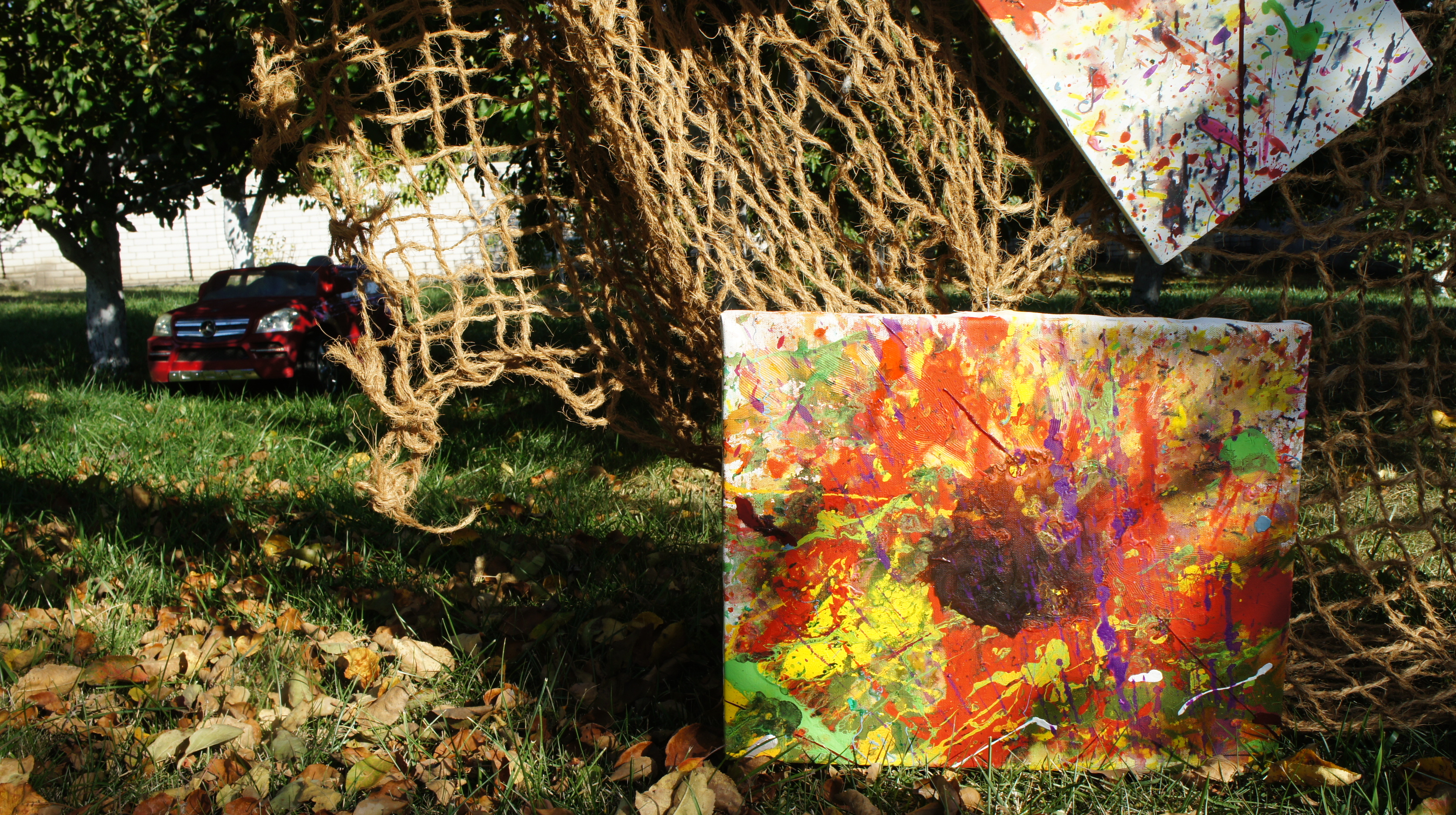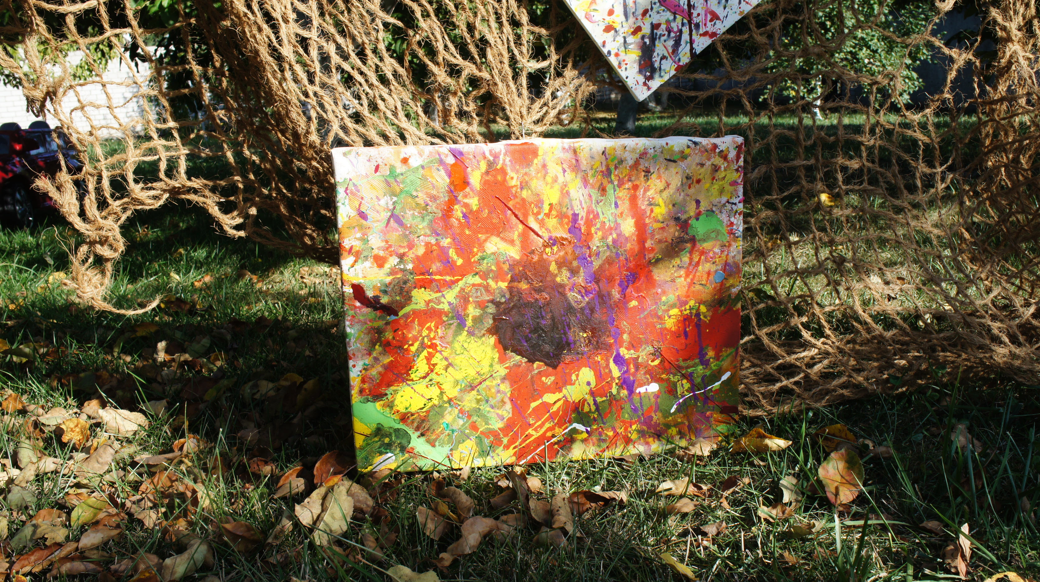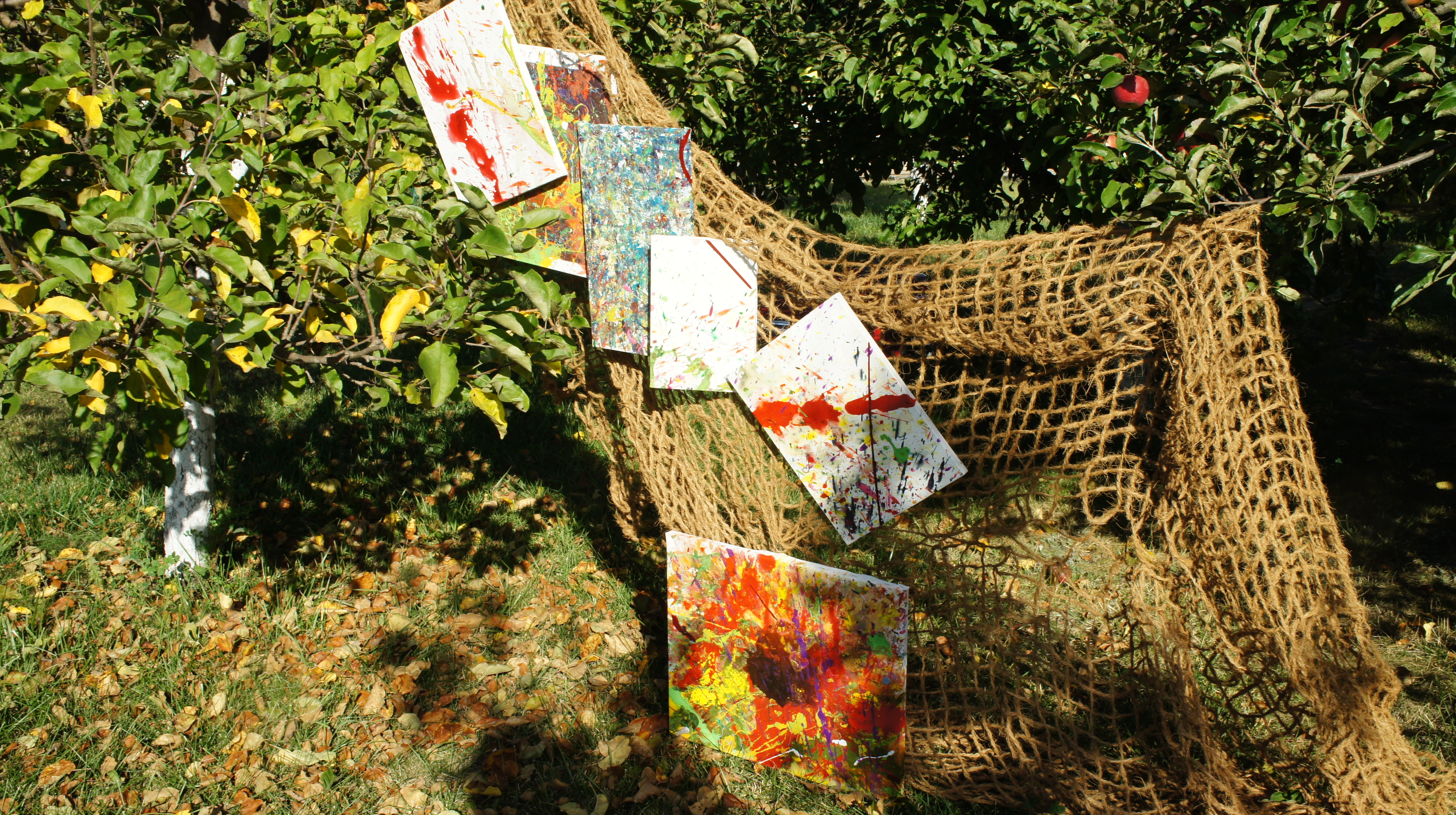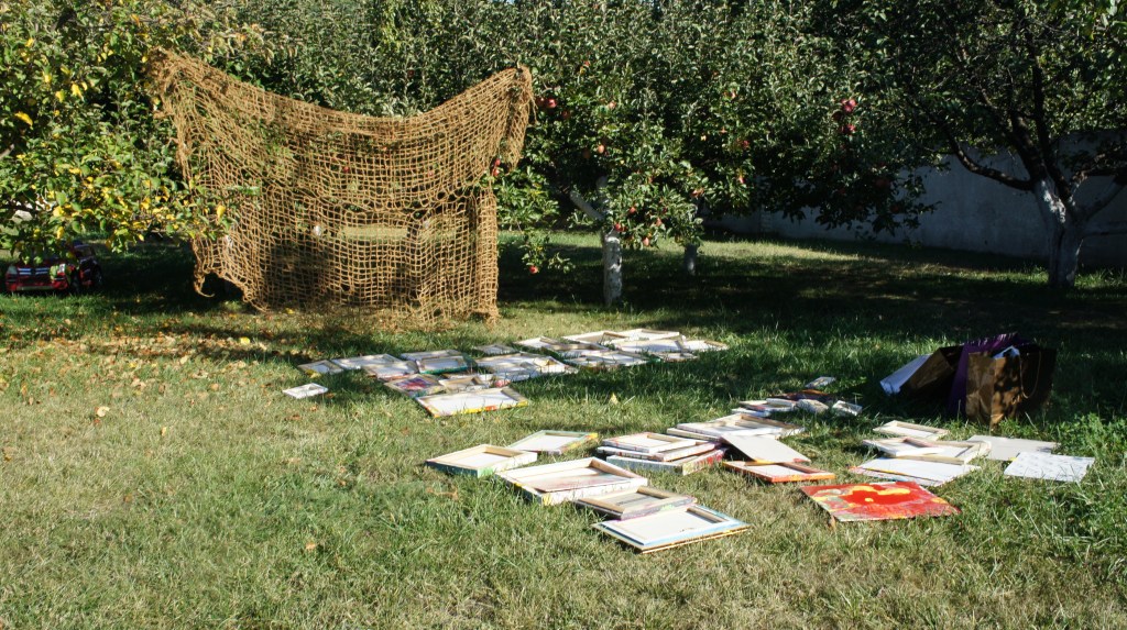 I wrote my works in the family garden. Installation of a series of splashes of colours on the branches of an apple tree. This can be said to be my interpretation of spring flowers on an apple tree. Paints, canvas.
